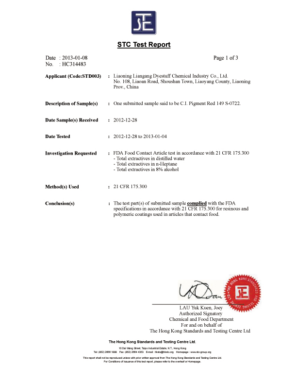 為了進(jìn)一步拓展我司產(chǎn)品顏料紅149(PIGMENT RED 149, S-0722)的應(yīng)用領(lǐng)域,同時(shí)應(yīng)廣大客戶要求,我司已將顏料紅149做了美國FDA的檢測和認(rèn)證,證書號為HC314483。檢測結(jié)果顯示我司產(chǎn)品顏料紅149完全符合FDA的認(rèn)證標(biāo)準(zhǔn)。這項(xiàng)權(quán)威的認(rèn)證結(jié)果表明我司所生產(chǎn)的的顏料紅149完全可適用于食品接觸(塑料包裝、薄膜及纖維拉絲等)領(lǐng)域。